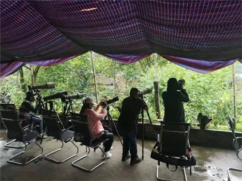 說(shuō)干就干,張朝江開(kāi)始在三河村蹲點(diǎn),早觀察、午投食、晚監(jiān)測(cè)……在山上一住就是幾天。2018年1月1日,在袁開(kāi)友的資助下和張朝江的日夜觀測(cè)選址后,三河村建起了2個(gè)觀鳥(niǎo)點(diǎn)作為試點(diǎn)。觀鳥(niǎo)點(diǎn)也被稱為鳥(niǎo)塘,搭建在鳥(niǎo)類棲息地的邊緣,經(jīng)過(guò)偽裝后很難被鳥(niǎo)發(fā)現(xiàn)。每個(gè)鳥(niǎo)塘設(shè)置8個(gè)機(jī)位,可以供鳥(niǎo)類研究者、攝影愛(ài)好者潛伏在偽裝棚內(nèi)觀察、拍攝。